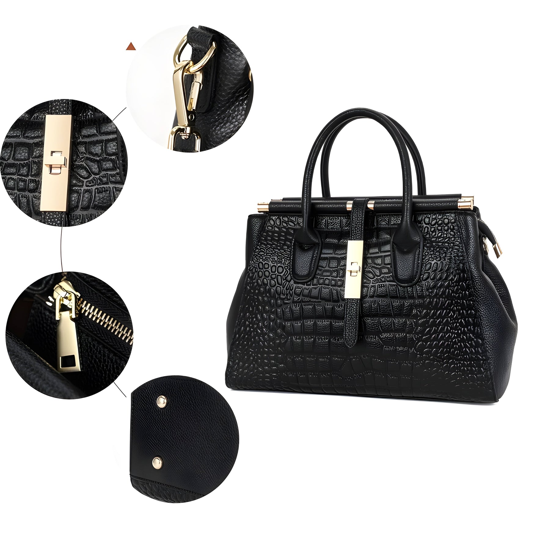 Elegance meets sophistication in this handcrafted bag, featuring a luxurious crocodile-embossed print on high-quality calfskin. The structured design is both modern and timeless, while the gold-plated magnetic closure adds a bold contrast against the glossy black finish, enhancing its chic appeal.