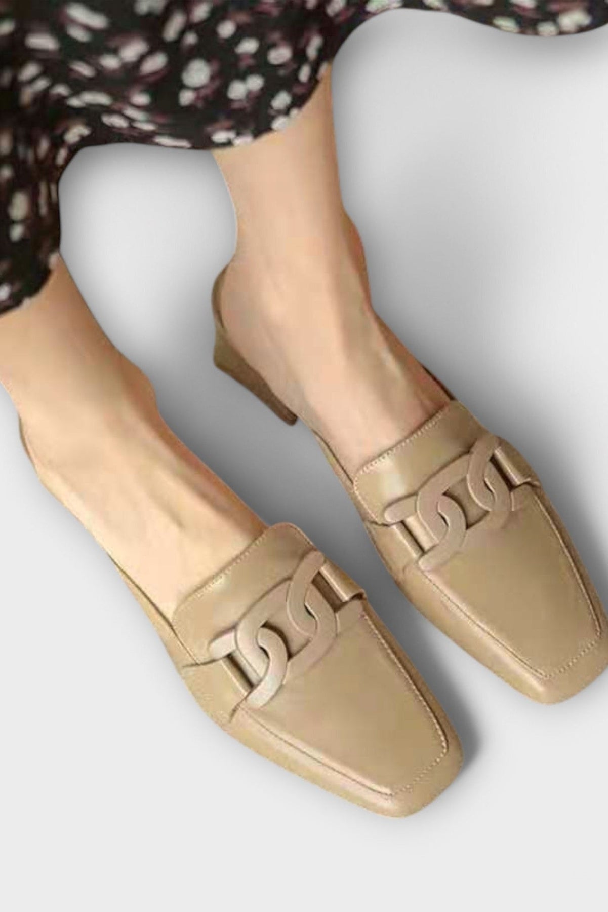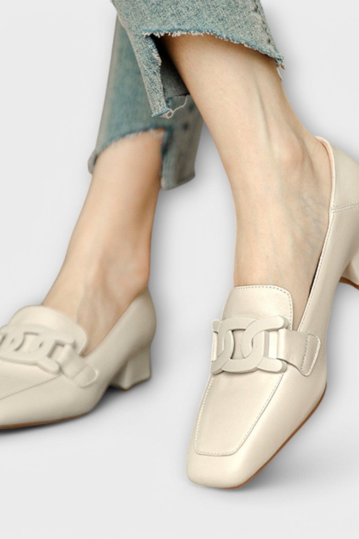 The Monica loafer is the definition of tailored elegance. With its sleek square toe, polished finish, and bold chain-link detail, Monica blends the poise of a pump with the ease of a flat. Whether you're dressing up for a meeting or adding structure to a casual outfit, Monica brings confidence and polish to every step. With its supportive low block heel and timeless silhouette, this loafer transitions effortlessly from day to night. Sophisticated yet wearable, Monica is a wardrobe essential for women who love modern classics with a twist.